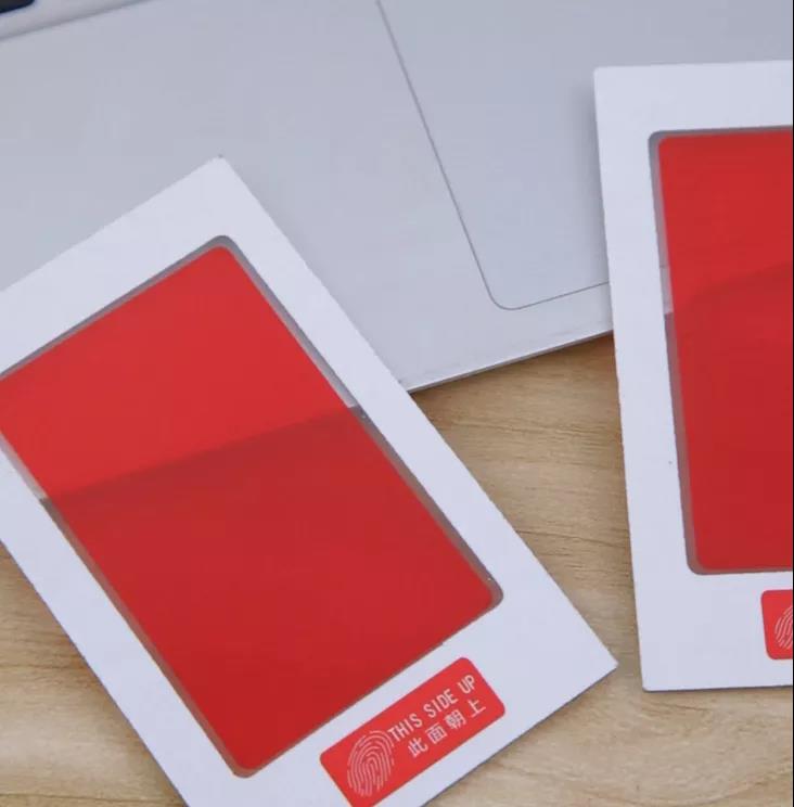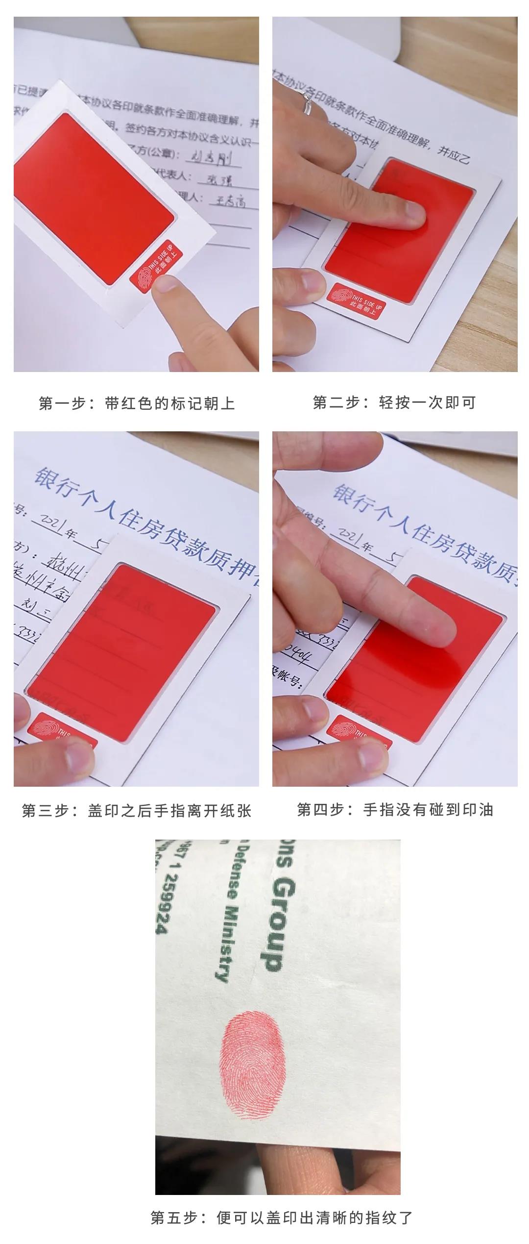 这款不沾印油指纹印片使用起来也很方便,只要把带红色标记的朝上,然后放在纸张上,轻轻用手指按印一下 ,便可以盖印出清晰的指纹。