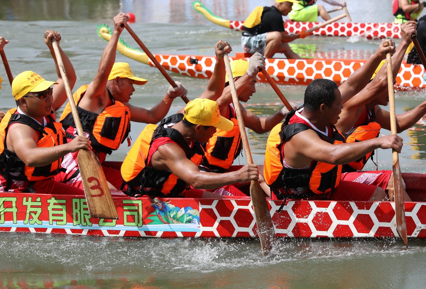 每到端午节,一次次别开生面的赛龙舟比赛吸引了许多人来观赏。比赛场上,十人为一组,骑在龙舟上,一起用脚控制龙舟的速度和方向,大家你追我赶,呐喊声此起彼伏,现场气氛越来越紧张而热烈。