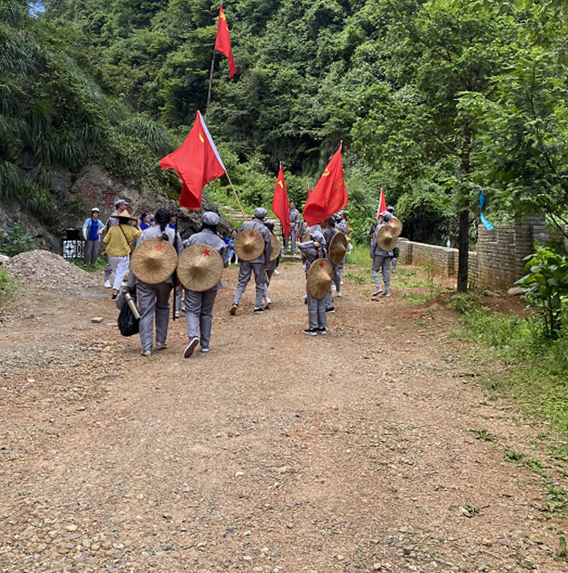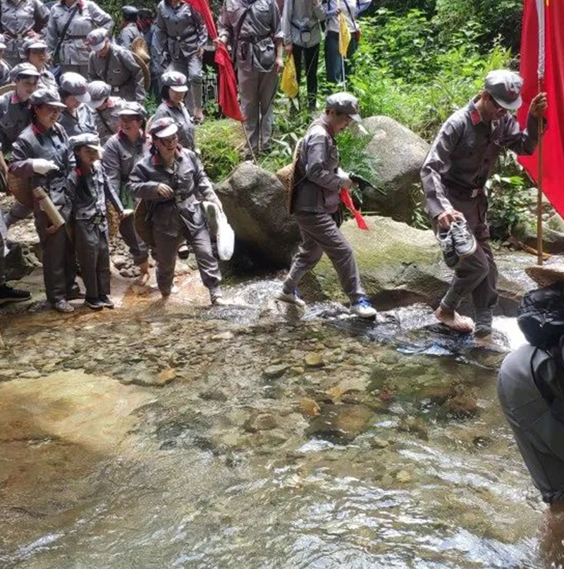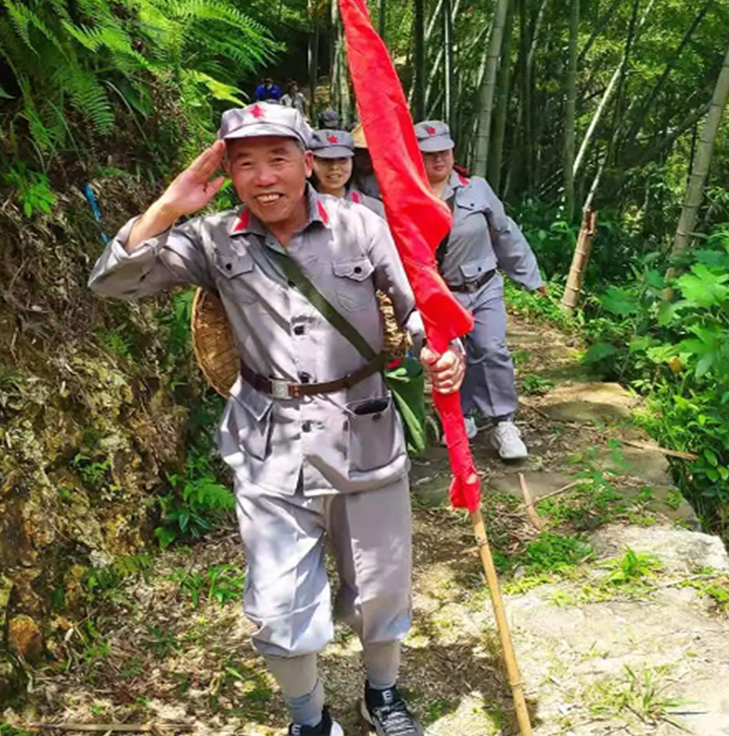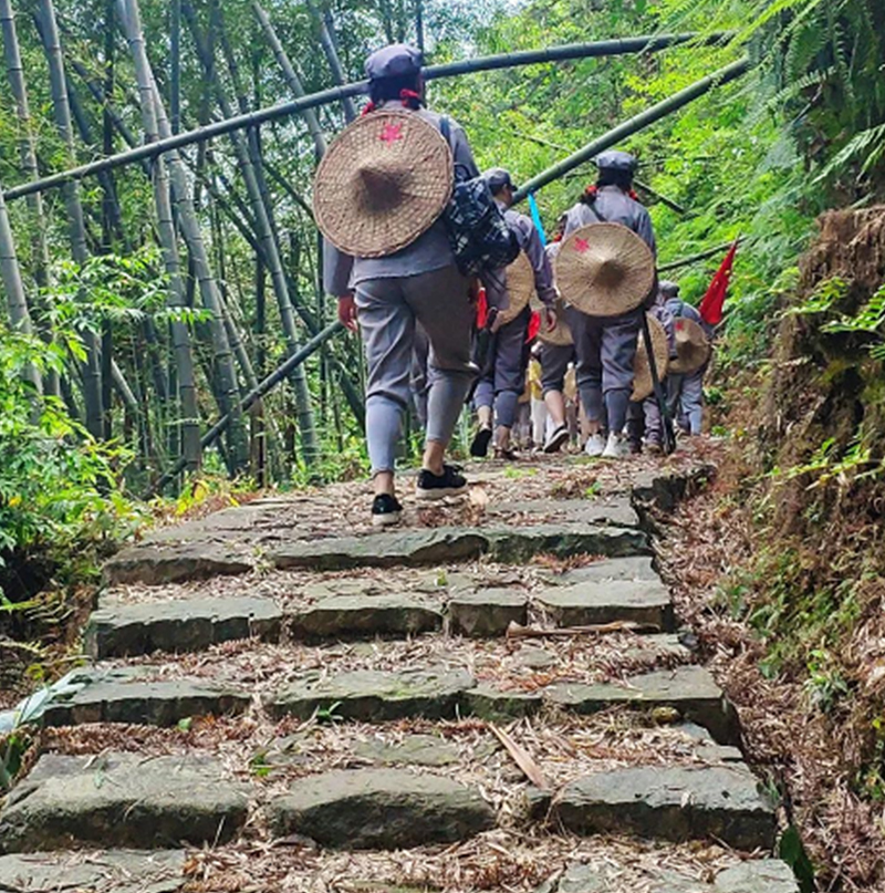 我们身穿红军军服,头戴八角帽,背挎红军包,佩戴党徽,手持军旗,高唱着红军歌行走于在郁郁葱葱的竹海之中,体验红军战士们斗争时期的艰苦岁月。