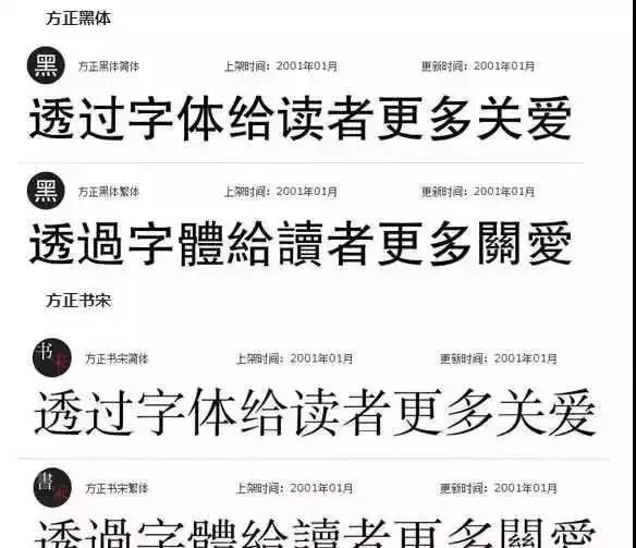 实在无法舍弃,就使用方正黑体、方正书宋、方正仿宋和方正楷体这几款免费商用的字体系列吧。
