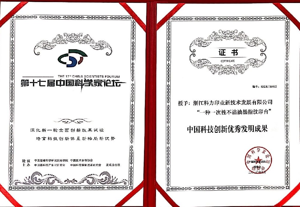 值此普天共庆佳节之际,科力印业喜获两项重磅创新奖励,新技术专利新产品“一种一次性不沾油墨指纹印台”喜获“中国科技创新优秀发明成果奖”,同时公司被授予“中国科技创新先进单位”的殊荣。