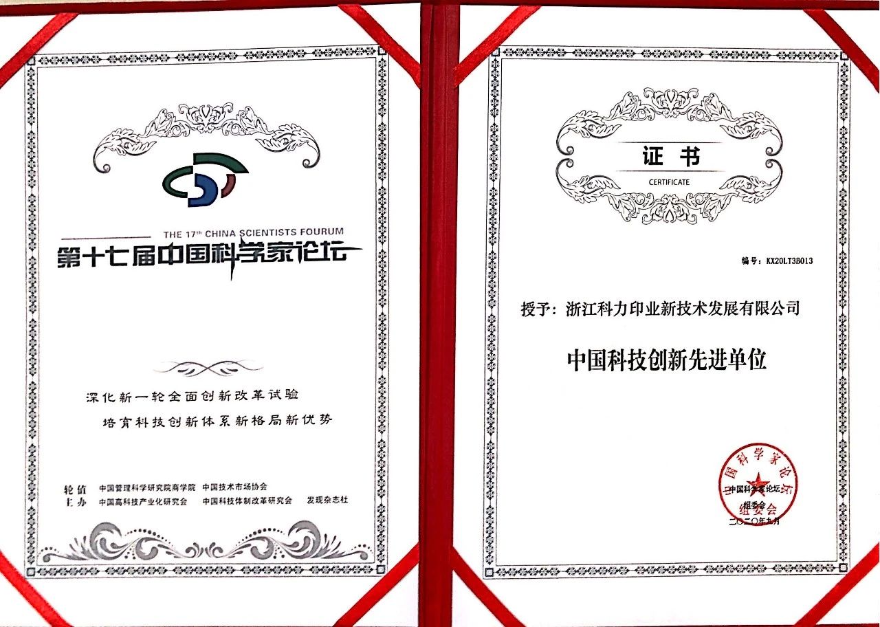 中国科学家论坛创办于2002年,在推动科技创新、促进产学合作等方面发挥了重要作用,是推动我国创新驱动发展的重要平台。科学技术部原副部长刘燕华在第十七届论坛上致辞:“新一轮科技革命和产业变革加速,人工智能、大数据、互联网、新技术、新业态方兴未艾。科学技术是第一生产力,创新是引领发展第一动力,科学和成果可以造成人类推进创新作用,从来没有像今天这样重要”。通过十七届论坛与各位专家们的综合评审,浙江科力印业新技术发展有限公司荣获了“中国科技创新优秀发明成果奖”和“中国科技创新先进单位”两项殊荣。