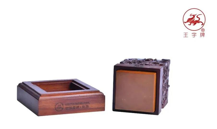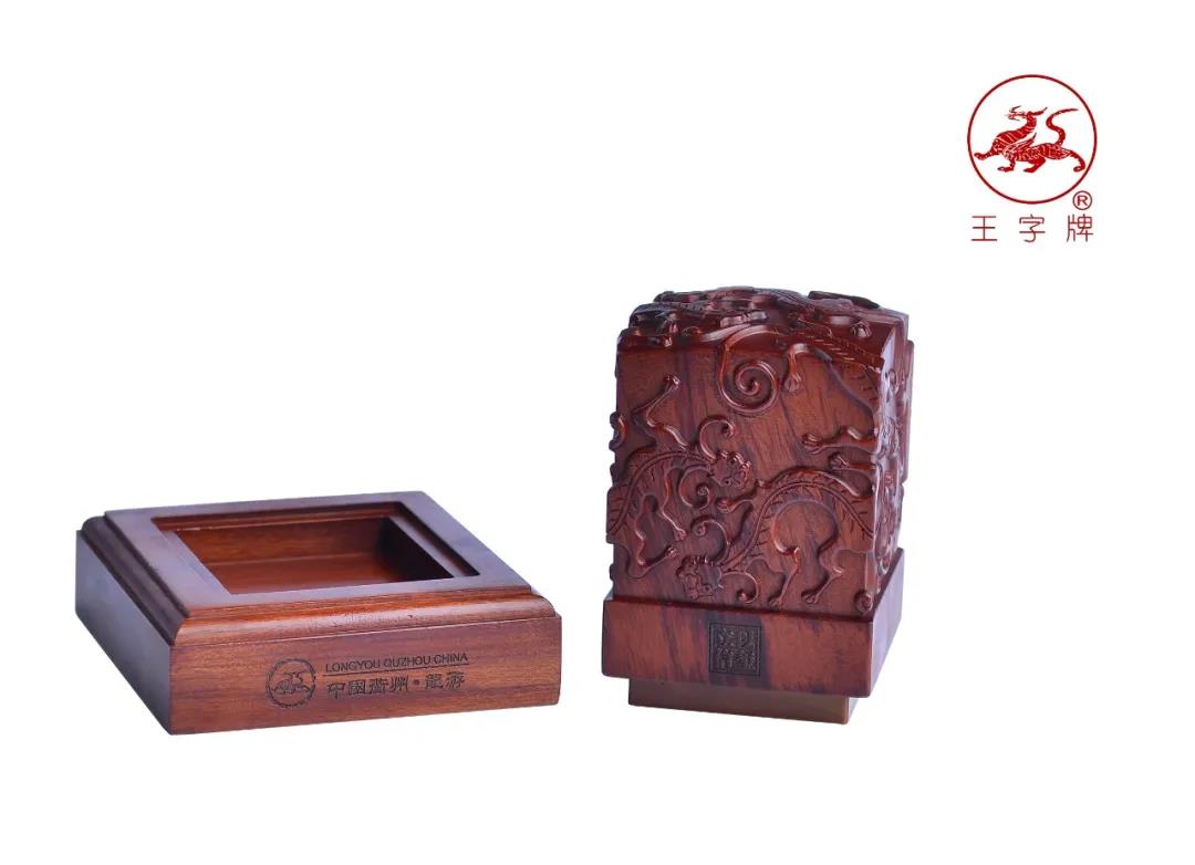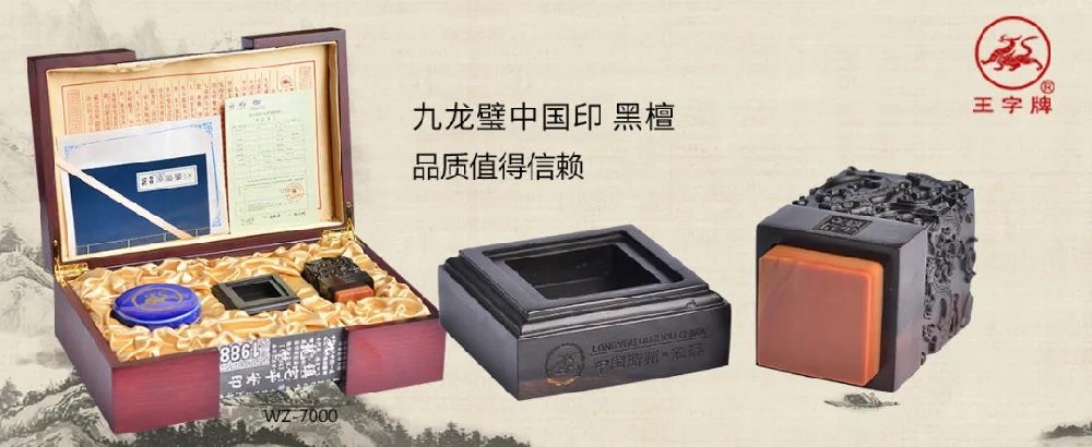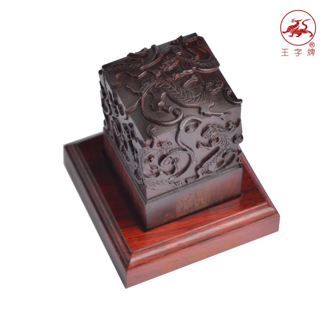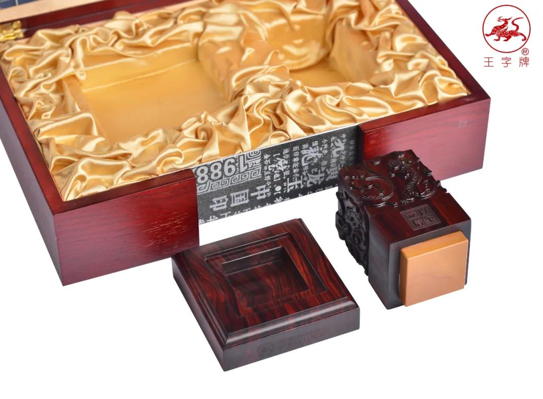 王字牌九龙璧中国印采用石中珍品龙游黄蜡石为材质,以名贵红木雕塑成九龙柱形主体,集高贵、典雅、华美为一身, 以示事业蒸蒸日上,天长地久。每方印章都由篆刻大师量身精雕而成,是专属您的传世藏品。